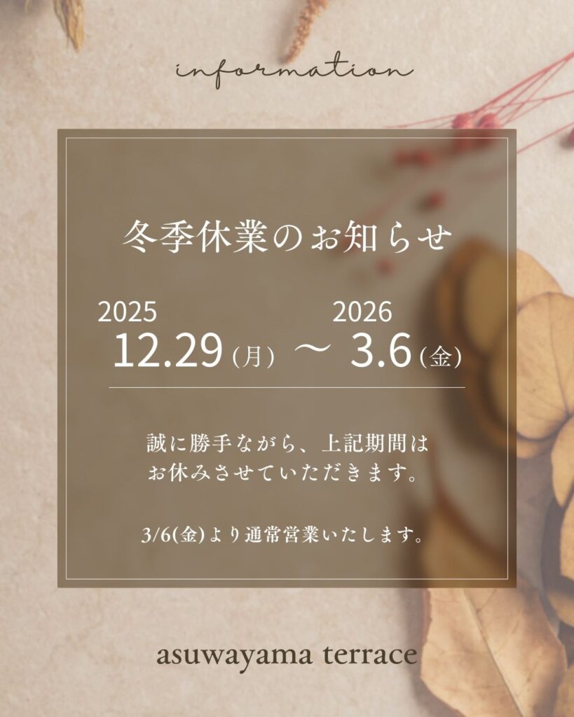 ※足羽山テラスにキッズスペースが完成いたしました!フラットシートの上で、のんびりお食事を召し上がれます。絵本もご用意しておりますので、お子様も飽きずに楽しめます!※毎週金曜日ハッピーフライデー開催!ピザ全品30%OFF 季節ごとに変化する美しい自然に囲まれた空間で、贅沢なひとときを過ごしていただくことをテーマにしたカフェ。四季を見て楽しむ足羽山に生息している多くの野鳥のさえずりや虫の声花や木々の香り福井産にこだわった素材自然を肌で感じる山の豊かさを五感で感じながら、当店自慢の石窯で焼いた本格ナポリピザや、こだわりぬいたコーヒーやスイーツをお楽しみください。 テラスから眺める四季折々の景色 春 桜色に染まる足羽山 春になると桜の花が咲き誇り、山全体がピンク色に包まれます。テラスから広がる絶景をお楽しみください。 夏 色とりどりの紫陽花 6月から7月にかけて見頃になる足羽山の紫陽花。色鮮やかで美しい紫陽花を眺めながら散策するがオススメです。 秋 美しい紅葉と心を落ち着ける季節 秋は足羽山全体が紅葉で染まり、黄色・赤・オレンジといった木々の景色を堪能することができます。秋の風景を楽しみながら、温かい飲み物やスイーツでほっと一息つく時間を過ごしてください。 冬 静けさと温かさが感じられる季節 1月から3月は積雪の為、当店は休業となりますが、雪が降り積もり雪化粧された足羽山は、とても神秘的で美しい光景が広がります。 ペレット型石窯ピッツァで本格ナポリ ~ 本格石窯の高温で焼き上げるピザ ペレット型石窯で焼くピッツァは、短時間で高温を実現し、均一な焼き上がりを提供。煙が少なく環境にも優しく、理想的な焼き加減で、まるでナポリで食べるような本格的な味わいをお楽しみいただけます。 RECOMMENDATION MENU スープカレー ピザ スイーツ その他ドリンク INSTAGRAM asuwayama.terrace 五感で楽しんで頂けるカフェがOPEN𓂃𓈒𓏸︎︎︎︎ 2025年4月10日グランドオープン 予約はお電話もしくはGoogleフォームにて🌿.∘ 📍福井県福井市足羽上町111 📞0776-43-3730 ⏱10:00-17:00 定休日 : 第3水曜日 🍂Autumn Vibes at 足羽山テラス🍂 足羽 🍂【11月の営業日のお知らせ】🍂 【Autumn sweets fair第三弾】 Autumn s 【Autumn sweets fair第三弾】 10月も Instagram でフォロー LINEお友達募集中 足羽山テラス公式LINEでは、メニューやイベントの最新情報をお届けします。また、新規でお友達追加していただいた方には、100円OFFクーポンをプレゼント!ぜひ登録してチェックしてくださいね! 足羽山テラスキッチンカー キッチンカー出店スケジュールはこちら INFORMATION 店名 足羽山テラス 営業時間 10:00 ~ 17:00 定休日 第3水曜日 電話番号 0776-43-3730 住所 〒918-8006福井県福井市足羽上町111 駐車場 有 お問い合わせ・ご予約 こちらのフォームから ※ご予約は平日のみ受け付けております。 Google Map